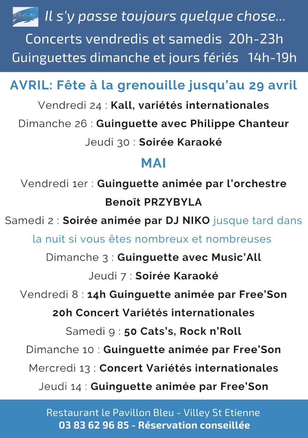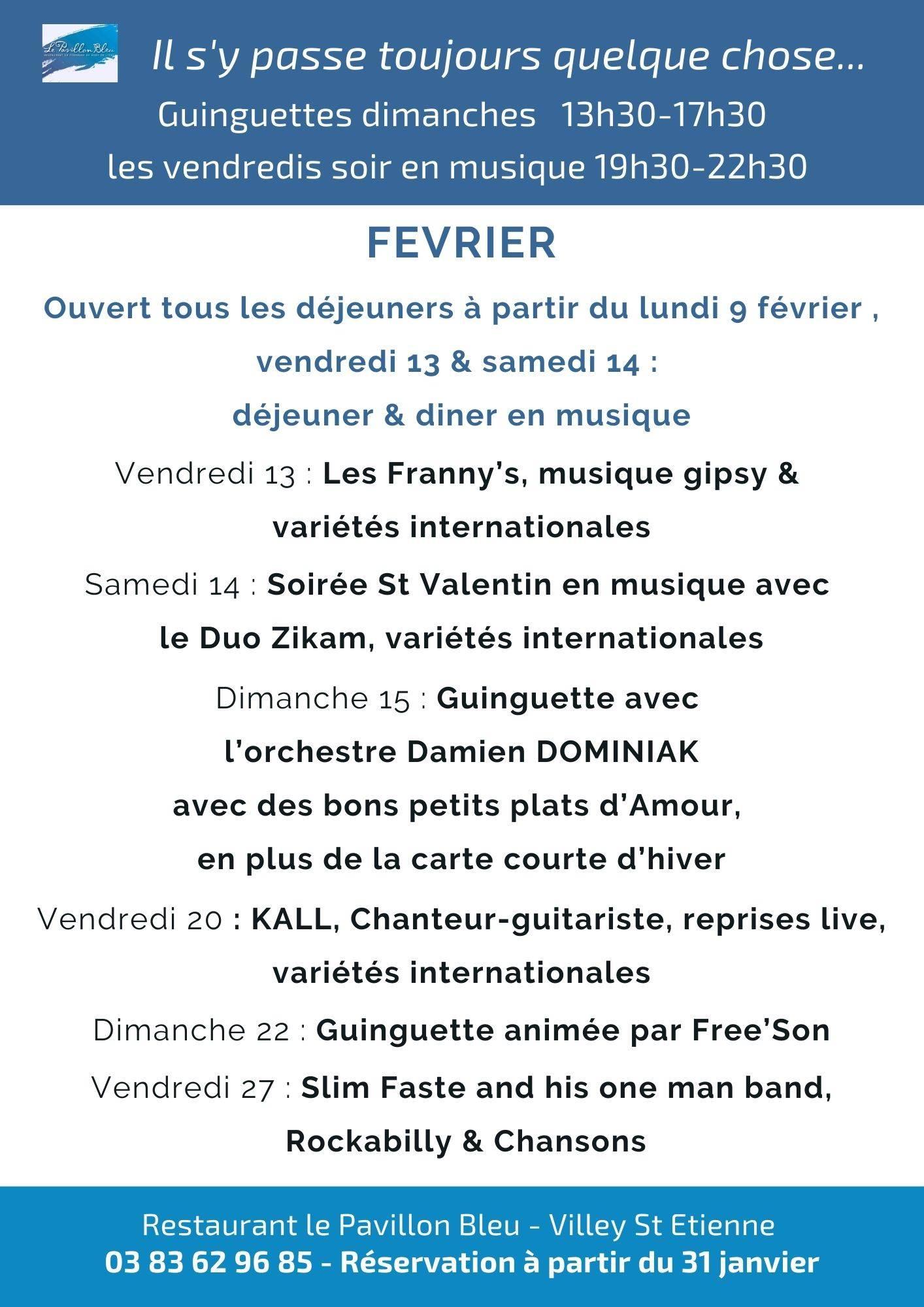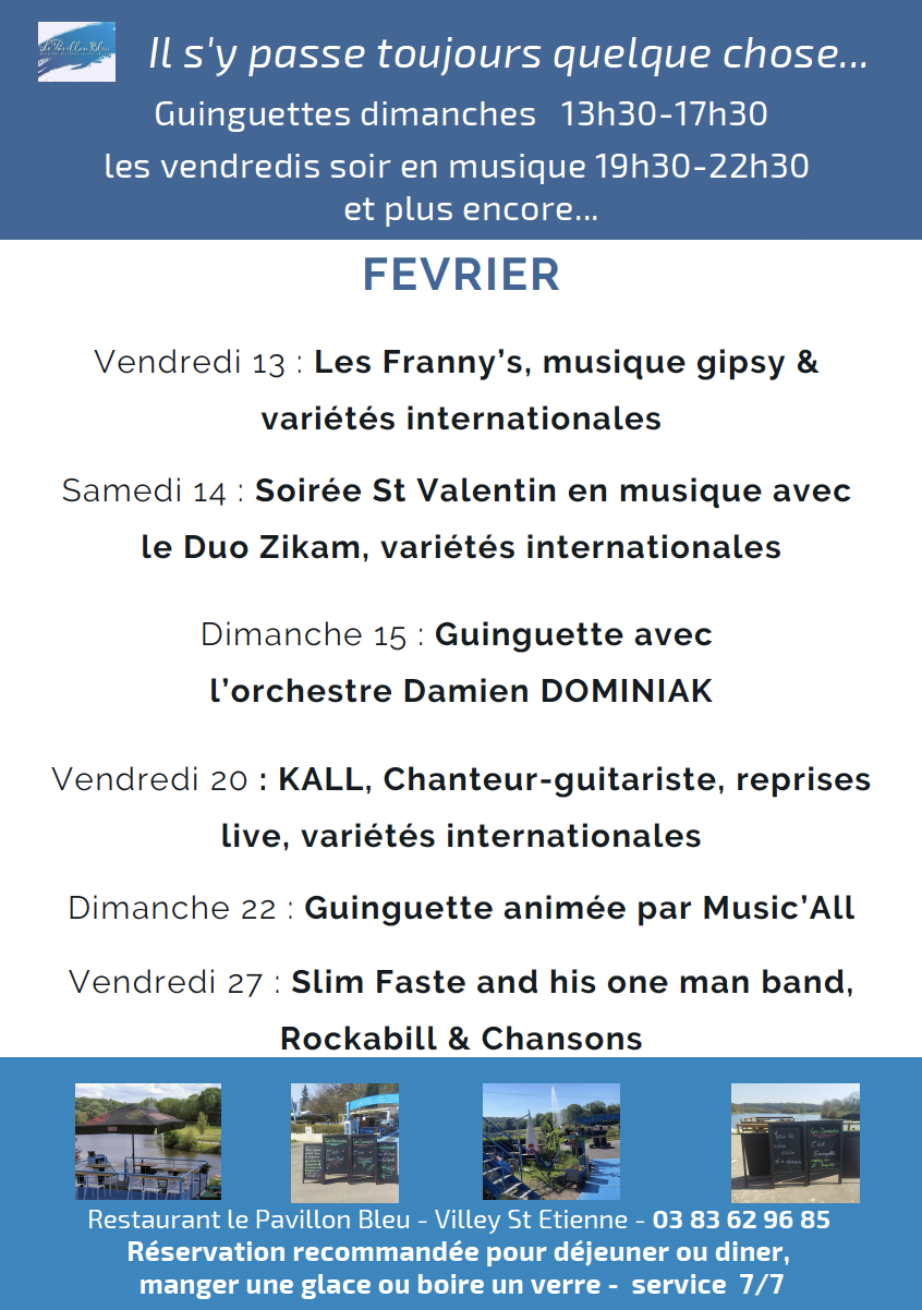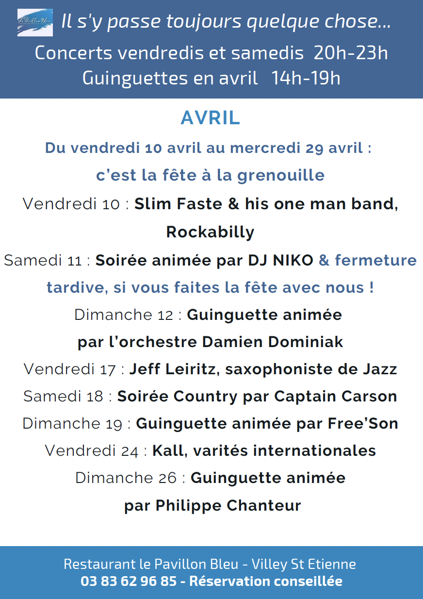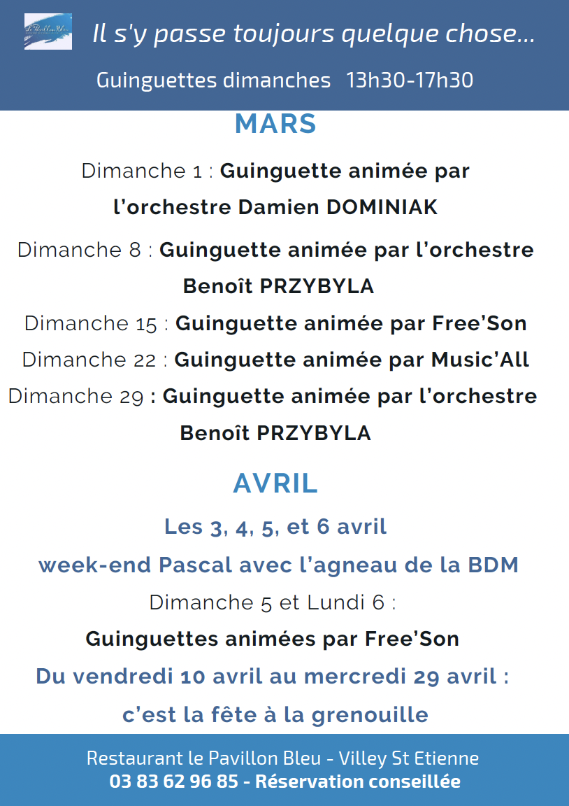Guinguette de 13.30 à 19 heures et de temps en temps des midis minuits. Le Pavillon Bleu est né sur ce parquet et reste le fleuron de l’enseigne
